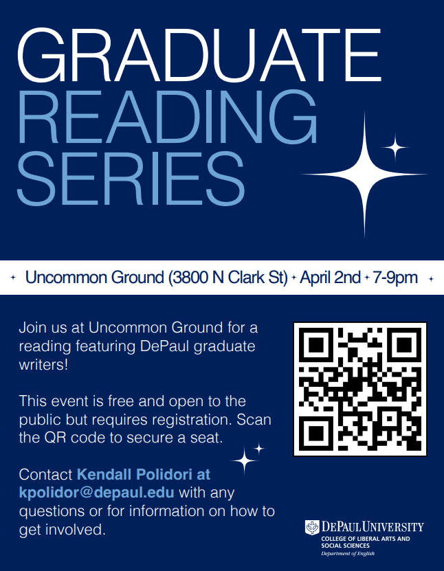 Join us for another Graduate Reading Series at Uncommon Ground (3800 North Clark Street) on Thursday, April 2, 2026 from 7-9 p.m. The event will feature six graduate writers in the MAWP/MFA programs, who will share their works of poetry or short prose. It’s a wonderful opportunity for fellow writers and readers to come together and celebrate creative storytelling! The reading is free and open to the public, but requires registration here to secure a seat. Doors will open at 6:30 p.m. and the reading will begin at 7 p.m. Contact Kendall Polidori at kpolidor@depaul.edu… Read Article →