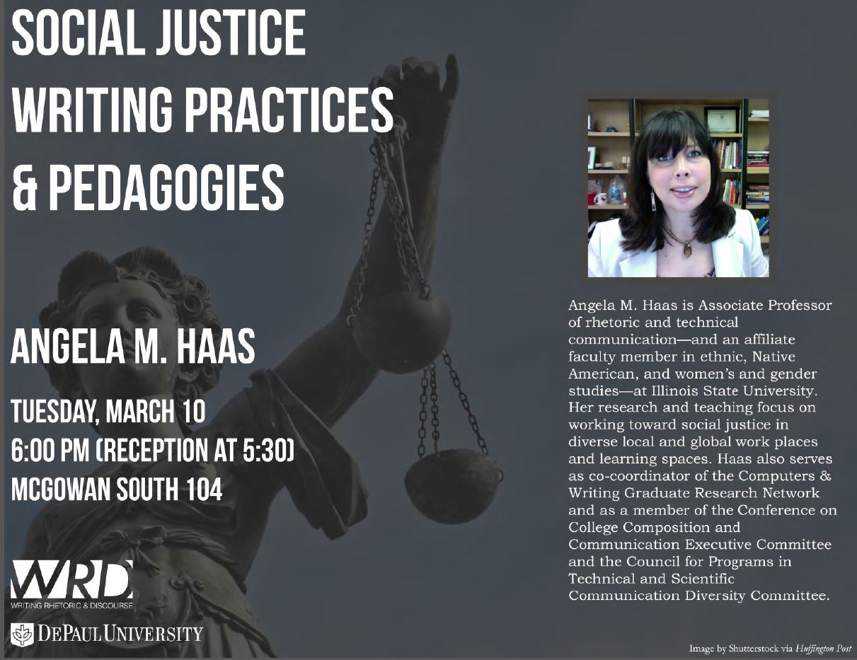 DePaul’s Department of Writing, Rhetoric, and Discourse (WRD) welcomes its winter quarter guest speaker—Angela Haas of Illinois State University—to DePaul on Tuesday, March 10. After a 5:30 p.m. reception, the talk will begin at 6 p.m. in McGowan South 104. See the flyer below for more information.