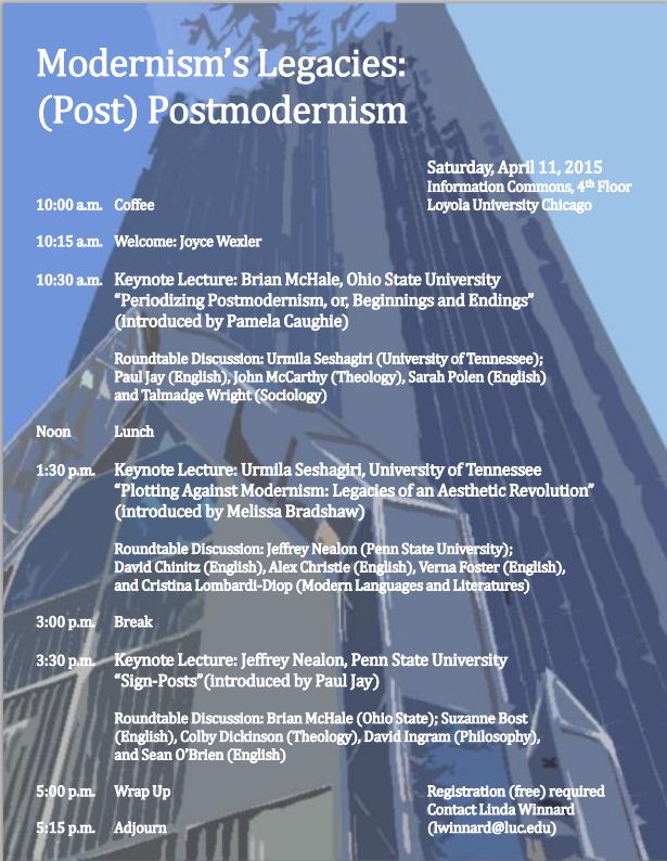 Loyola University Chicago’s English department is hosting a symposium called Modernism’s Legacies: (Post) Postmodernism on Saturday, April 11, 2015. Registration is required for this free event. See the flyer below for more information.