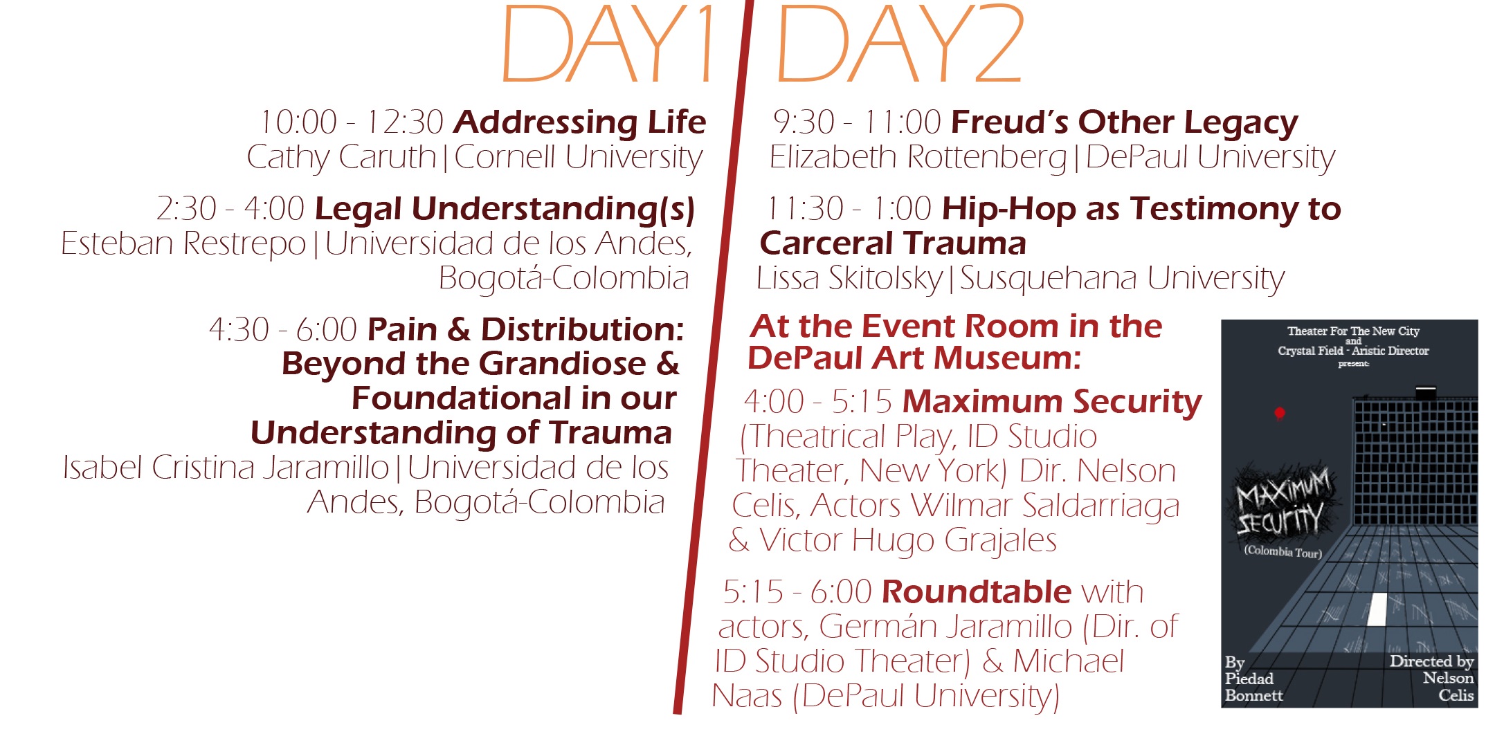 The workshop will conclude on Friday evening with a performance of the play Maximum Security and concurrent roundtable discussion from 4:00-6:00 pm at the event room in the DePaul Art Museum.