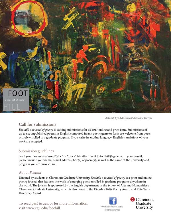 Claremont Graduate University’s Foothill: a journal of poetry is currently seeking graduate submissions. Foothill is unique as the only exclusive publisher of graduate student poetry.