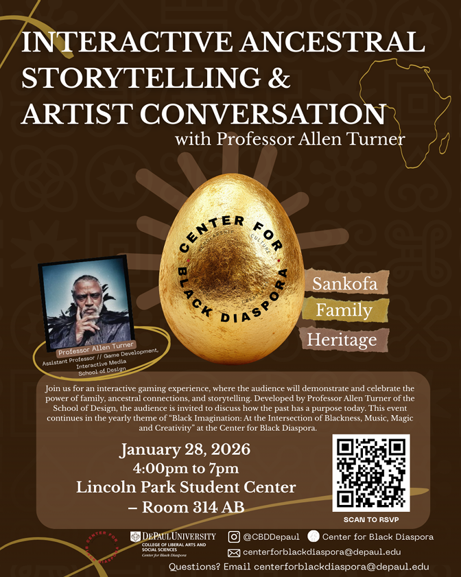 Join us on Wednesday, Jan. 28, 2026 for an interactive gaming experience developed by Professor Allen Turner of the School of Design. The audience is invited to discuss how the past has purpose today by demonstrating and celebrating the power of family, ancestral connections, and storytelling. This event continues in the yearly theme of “Black Imagination: At the Intersections of Blackness, Music, Magic and Creativity” at the Center for Black Diaspora.