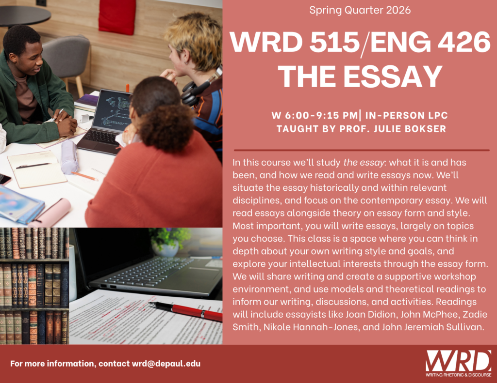ENG 426 The Essay: History, Theory, Practice is cross-listed with WRD 515 The Essay.