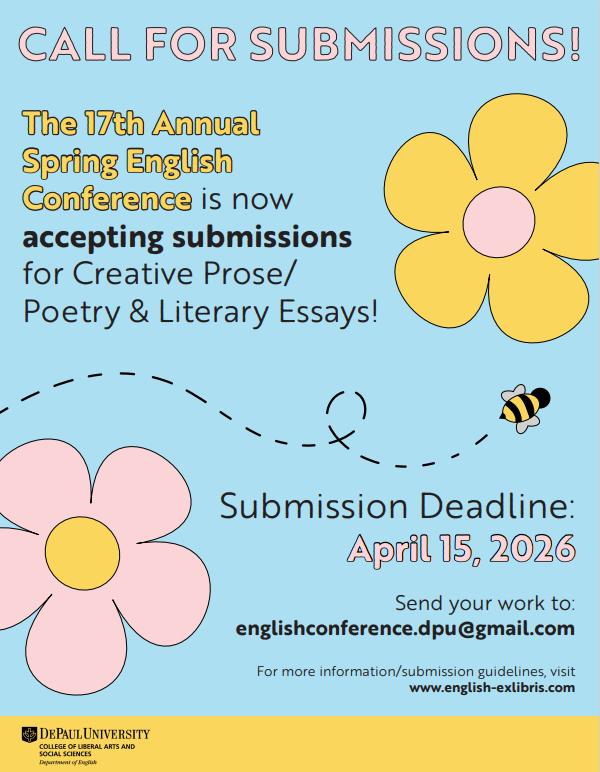 Please submit your work to englishconference.dpu@gmail.com and include your name, area of concentration/major, genre, and length of piece. If your piece is literary theory or literary analysis, please include a brief abstract. (All applicants must be currently enrolled in the English program, either as majors or minors.) We welcome work from graduate (MALP & MAWP) and undergraduate students!