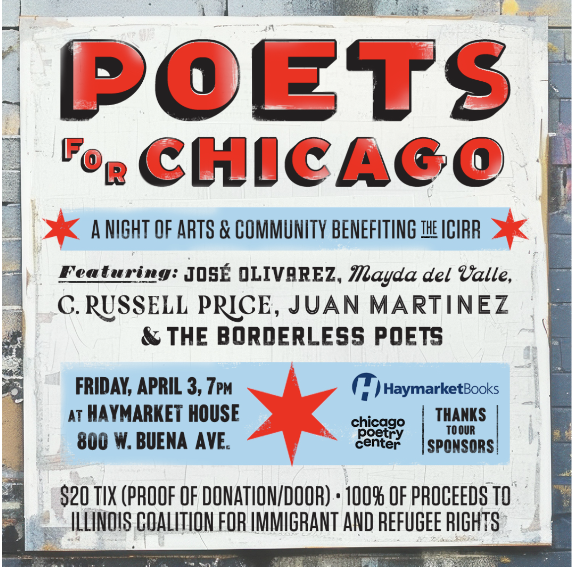 “Poets for Chicago” is hosting another benefit reading for the Illinois Coalition for Immigrant and Refugee Rights (ICRR) on Friday, April 3 in Uptown. The event will feature poets José Olivarez, Maya del Valle, C. Russell Price, Juan Martinez and The Borderless Poets. See below for more details: