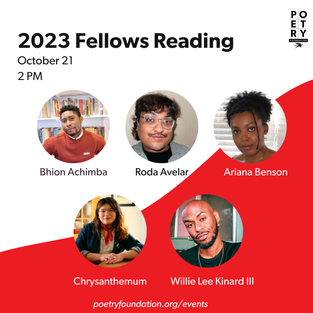 The Ruth Lilly and Dorothy Sargent Rosenberg Poetry Fellowships are among the largest awards for emerging poets between the ages of 21-31. The Poetry Foundation is excited to showcase the 2023 fellows in a public reading on Saturday, October 21 at 2:00PM (CT), hosted by Joy Priest at the Poetry Foundation in Chicago. Applications for the 2024 Ruth Lilly and Dorothy Sargent Rosenberg Fellowships will open March 4, 2024 with an April 15, 2024 deadline. For more information on the fellowships, please follow the link.