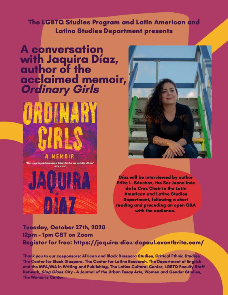 Mark your calendars and register for this conversation between authors Jaquira Díaz and DePaul professor Erika Sánchez as they discuss Díaz’s debut memoir, Ordinary Girls. Díaz will be interviewed by Erika Sanchez, the Sor Juana Ines de la Cruz Professor of Latin American and Latino Studies and herself the author of I Am Not Your Perfect Mexican Daughter, which was a finalist for the National Book Award.