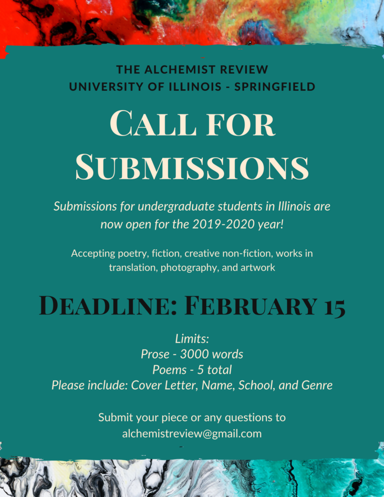 The Alchemist Review is the literary journal at the University of Illinois at Springfield is excited to announce their journal is open to submissions from all undergraduate students in Illinois! The Alchemist Review is a print journal that launches in April. They publish creative writing including but not limited to fiction, poetry and creative non-fiction, art, and photography by new and experienced writers. They especially encourage submissions from women, people of color, LGBTQIA+ writers, writers with disabilities, and writers with intersectional identities. Their submission deadline is February 15, 2020. Submission details can be found on their website. All… Read Article →
