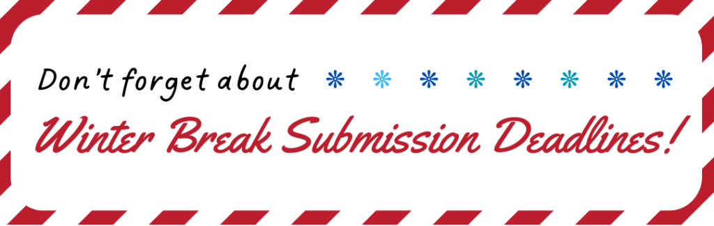 Classes are ending, final papers and exams are almost finished…but don’t lose sight of these calls for submissions and application deadlines over winter break! Below is a list of upcoming deadlines, sorted by week, between November 18, 2024 and January 6, 2025. (Visit the “Calls for Submissions” and “Career Builders” tabs for more info on each of these items.) Monday, Nov. 18 – Sunday, Nov. 24 (None) Nov. 25 – Dec. 1 Dec. 2 – Dec. 8 Dec. 9 – Dec. 15 Dec. 16 – Dec. 22 (None) Dec. 23 – Dec. 29 (None) Dec…. Read Article →