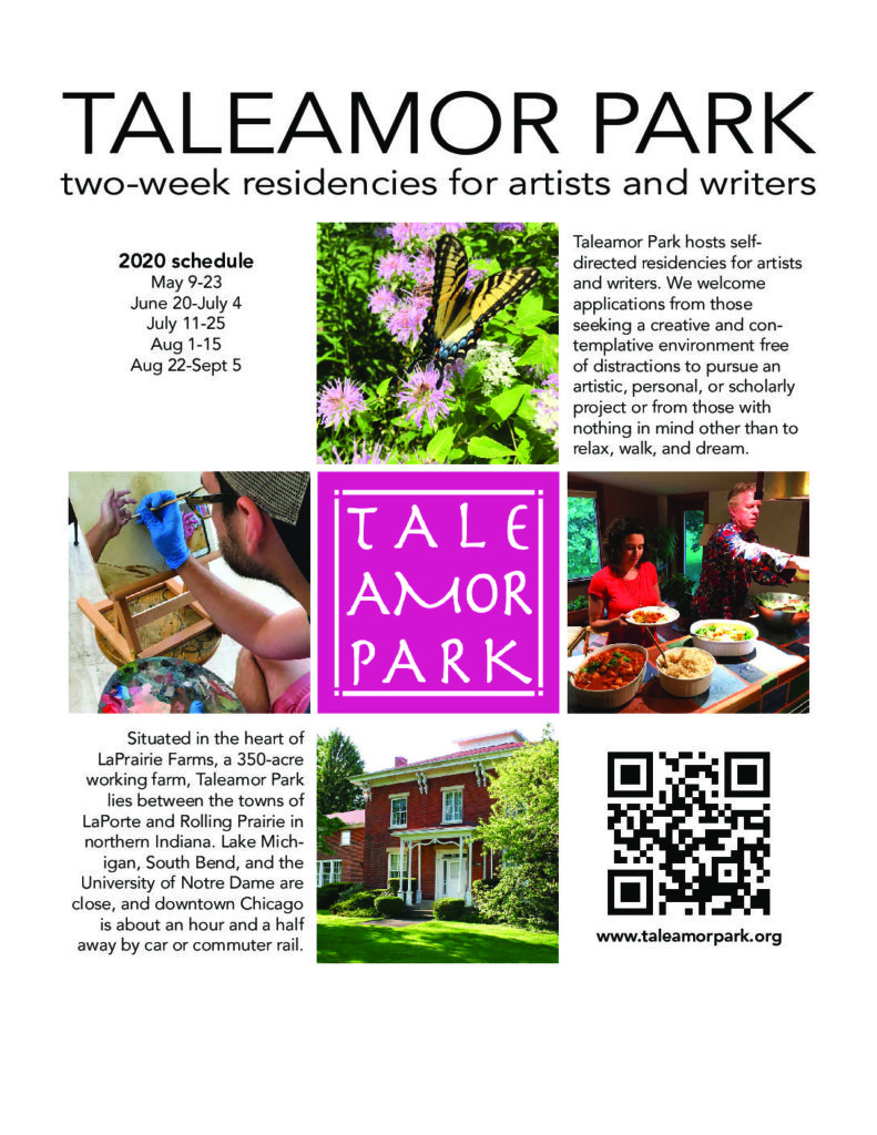 Taleamor Park, located on a scenic farm 60 miles east of Chicago, is offerong two-week residencies for writers and artists in all media between May 9 and September 5. Residents live in a lovely 1854 Italianate farmhouse that has four private air-conditioned bedrooms, two bathrooms, two kitchens, a laundry room, two common rooms, a library, a writing nook, and a paper studio. Vintage outbuildings offer both private and spacious shared studio spaces. Verdant walking trails wind from the native plant and vegetable gardens, on through fields of grain, and further to woods and ponds and scenic vistas. Taleamor Park borders the mid-continental divide, from which waters flow either to… Read Article →