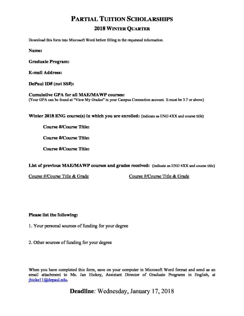 Applications are now available for Winter Quarter 2019 Partial Tuition Scholarships (PTS) Awards. Find out more here, and download the application here. The M.A. in English and M.A. in Writing and Publishing programs are offering Partial Tuition Scholarships (PTS) to recognize the outstanding academic achievement of students in the English department’s two graduate programs. Partial Tuition Scholarships provide a partial reimbursement for tuition paid for 2019 winter graduate courses in English taken toward the MAE and MAWP degrees.