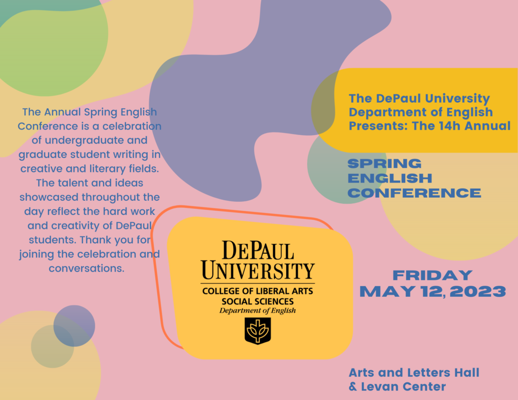 Join us Friday, May 16, for the English Department’s biggest event of the year—our Spring English Conference & Celebration! In addition to presentations from Literary Studies and Creative Writing student panelists, this event will also feature a networking opportunity and career discussion with DePaul English alumni, work from MFA students, and an awards ceremony where high-achieving English students will be recognized with certificates. (There will also be a celebration cake, morning refreshments, and a buffet-style lunch!) Scroll down to view our full schedule of events and other conference materials! What is the Spring English Conference?… Read Article →
