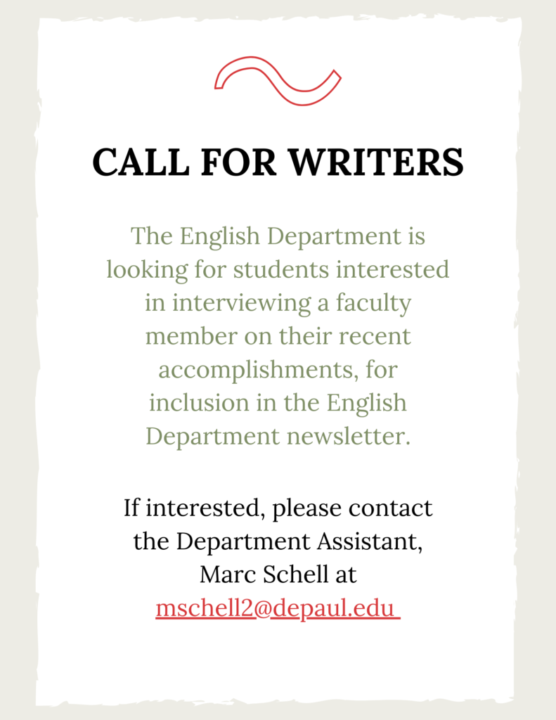 The English Department is looking for students interested in interviewing a faculty member on their recent accomplishments for inclusion in the English Department newsletter. If interested, please contact the Department Assistant, Marc Schell at mschell2@depaul.edu. Please note: Newsletter contribution is voluntary. We are not currently offering compensation for interviews.