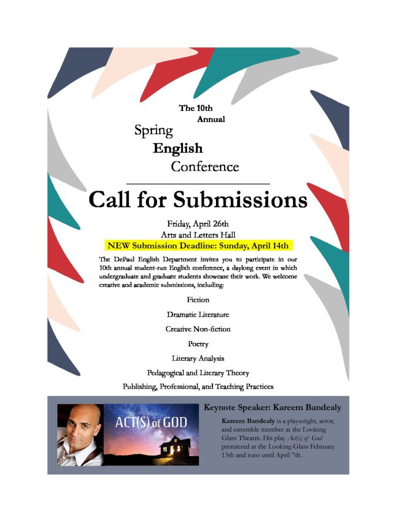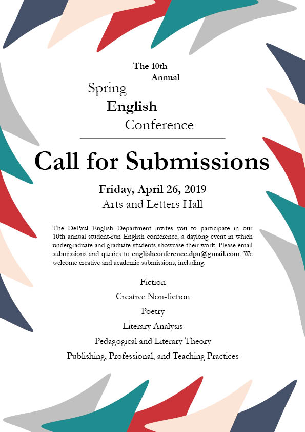 The 2020 Spring English Conference, hosted by DePaul’s English department, is now open for submissions! Please see the attached flyer and full submissions guidelines for information on how to submit your writing: 2020 English Conference Full Submissions Guidelines 2020 Spring English Conference Call for Submissions
