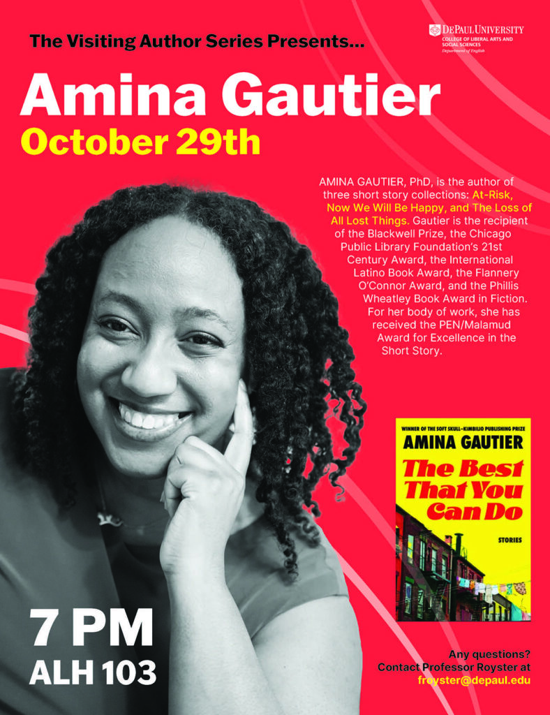 Join us Tuesday, October 29, at 7PM (in ALH 103) to welcome award-winning author Amina Gautier! Gautier’s publications include four short story collections: At-Risk, Now We Will Be Happy, The Loss of All Lost Things, and most recently, The Best That You Can Do. Gautier is currently a professor in the MFA program at the University of Miami. For any questions about this event, contact Professor Royster at froyster@depaul.edu.