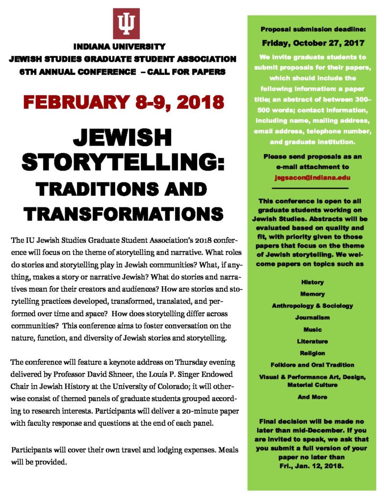 Indiana University’s Jewish Studies Graduate Student Association is pleased to announce the 6th Annual Jewish Studies Graduate Student conference, sponsored by the Robert A. and Sandra A. Borns Jewish Studies Program. The conference is titled “Jewish Storytelling: Traditions & Transformations” It will be held on Thursday, February 8  and Friday February 9, 2018 in Bloomington, Indiana. Abstracts are due to mailto:jsgsacon@indiana.edu by Friday, October 27 For more information see the flyer above.