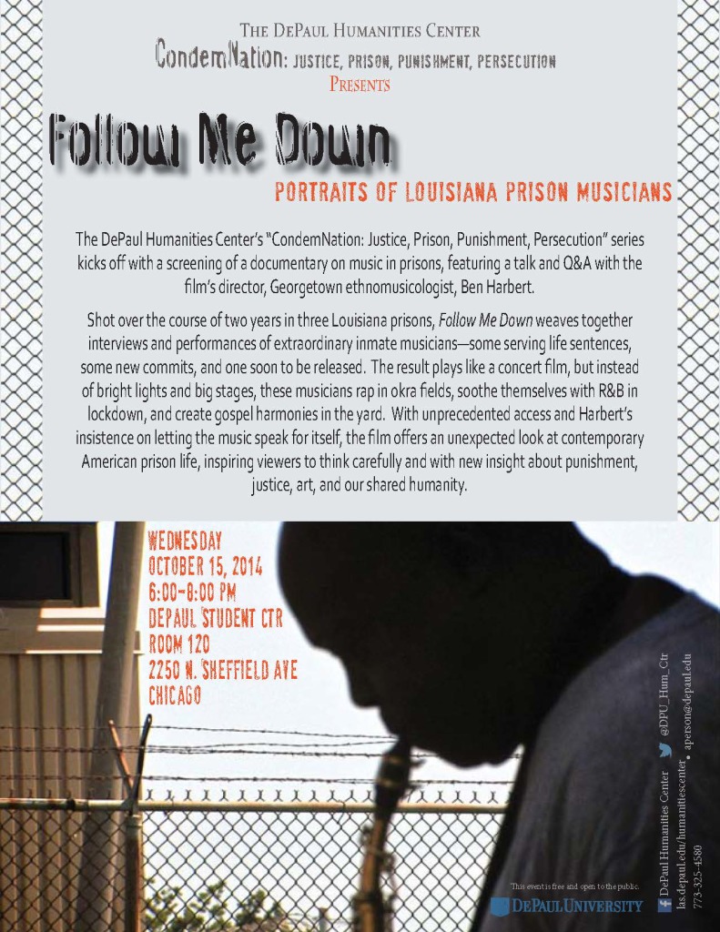 Ben Harbert’s Follow Me Down: Portraits of Louisiana Prison Musicians October 15, 2014, 6–8 p.m. DePaul Student Center, Room 120 Tonight’s screening and director Q&A is the inaugural event in the DePaul Humanities Center series CondemNation: Justice, Prison, Punishment, Persecution.