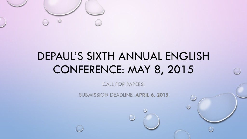 Sixth Annual English Department Spring Conference Friday, May 8, 2015 • Arts & Letters Hall, 2315 North Kenmore Avenue Keynote Speaker Crystal Chan, Author of Bird DePaul English students now have one more week to submit their original poetry, fiction, creative nonfiction, literary analyses or criticism, and other work to this annual student-run conference. The conference theme is Wonder. The new deadline is Monday, April 15. Please send submissions or inquiries to: egsaconference2015@gmail.com. Submission Guidelines 1. Submit 300- to 500-word abstracts OR complete papers (complete papers are preferred, but abstracts are fine, too) for up to two works… Read Article →