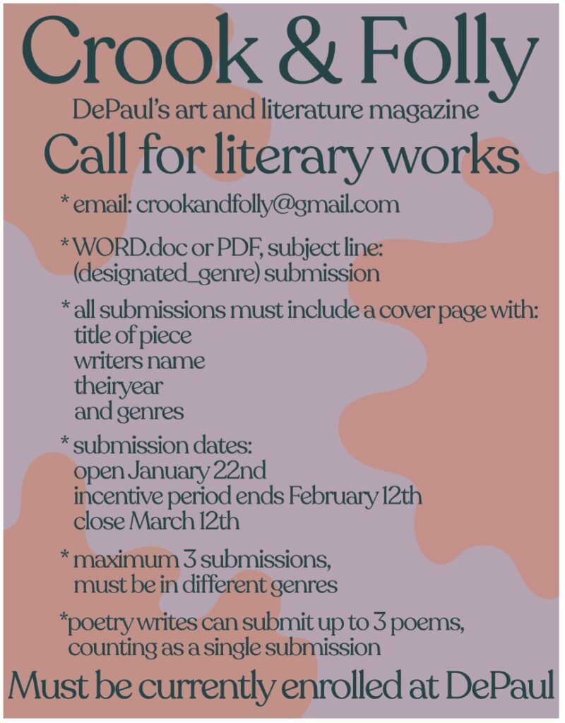 DePaul literary magazine Crook & Folly is hosting an open mic reading on Thursday, April 16. The reading will take place from 6 p.m. to 8 p.m. in Room 115 of Richardson Library. Undergraduate and graduate students are welcome to attend and share their fiction, nonfiction, poetry, and micro prose pieces. Complimentary donuts and coffee will be up for grabs.