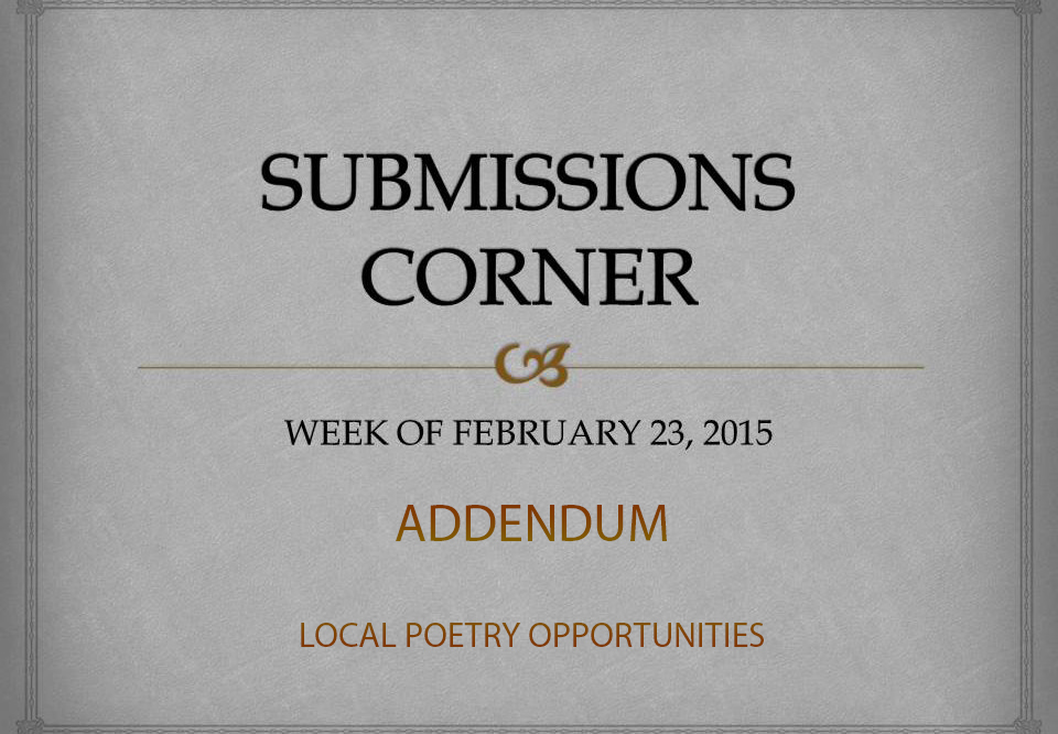 Saturday, February 28: The deadline for Highland Park Poetry’s 2015 Poetry Challenge.  Highland Park Poetry is seeking poems in one of three categories: 1) food, 2) wonderland (in honor of the 150th publication anniversary of Alice in Wonderland), or 3) an etheree. Poets may submit one poem for free; additional poems incur a reading fee of $4 each. Sunday, March 1: The deadline to submit to the 2015–2016 edition of Highland Park journal East on Central. Tuesday, March 10: The deadline to submit to Chicago Poetry Press’s Journal of Modern Poetry (JOMP) 18. The theme is peace. Friday, March 20: The deadline to… Read Article →