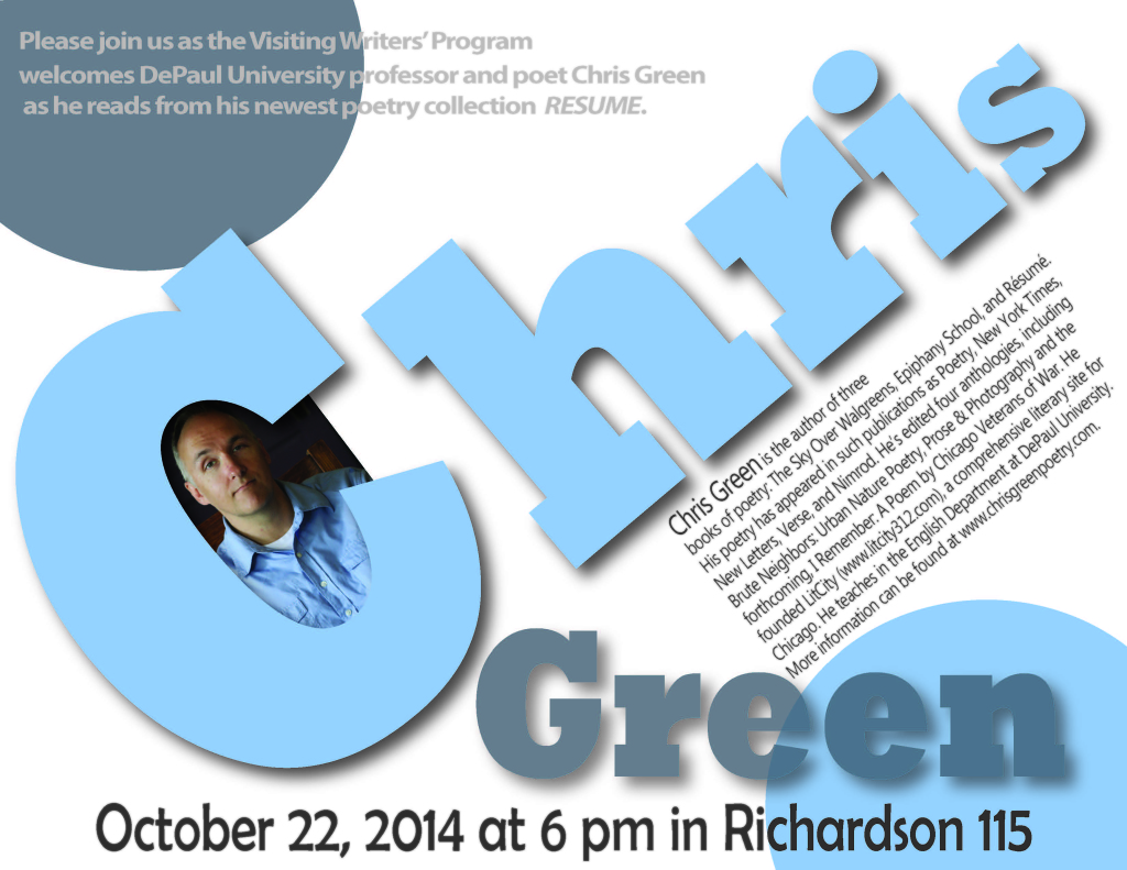 The Visiting Writers’ Program welcomes DePaul faculty member and poet Chris Green as he reads from his new collection, Résumé, at 6 p.m. on Wednesday, October 22, in Richardson 112. Check out the Résumé book trailer below.